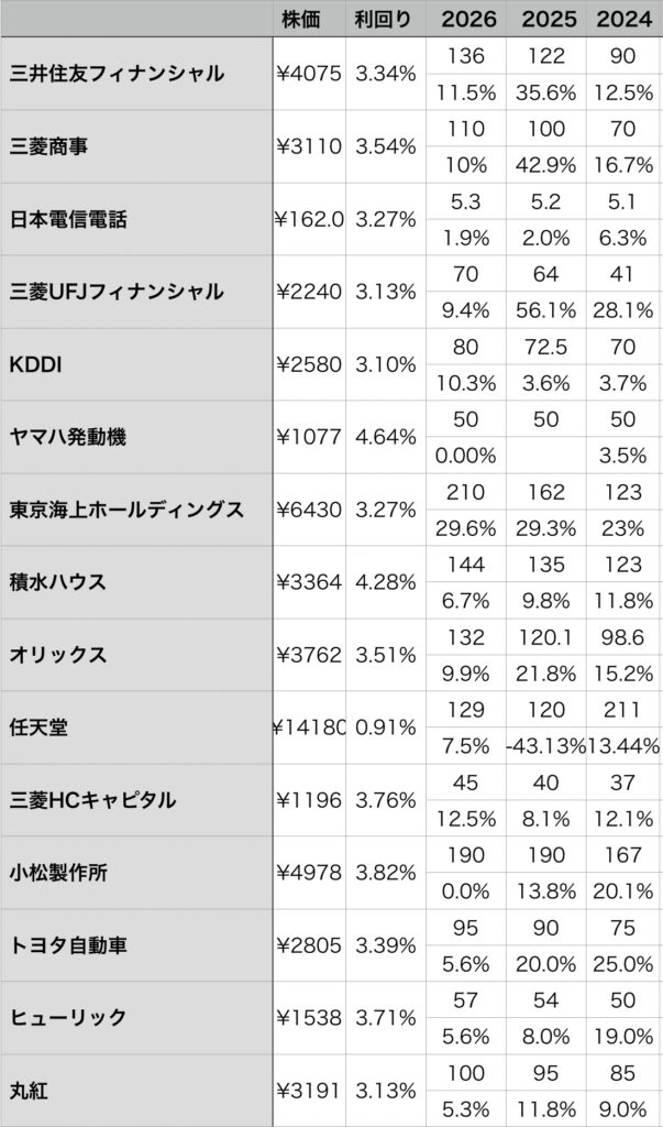 こちらが私の配当株のポートフォリオと15日終値での配当利回り、対前年増配率です。